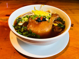 Rice noodle, duck leg, duck broth, bok choy, bean sprout, crispy garlic, cilantro and scallion