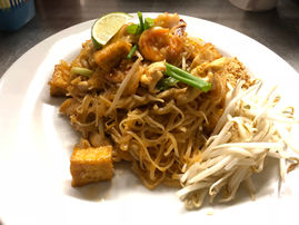Thin rice noodle stir-fried in spicy basil tamarind fish sauce with bean sprout, scallion and egg garnished with ground peanut